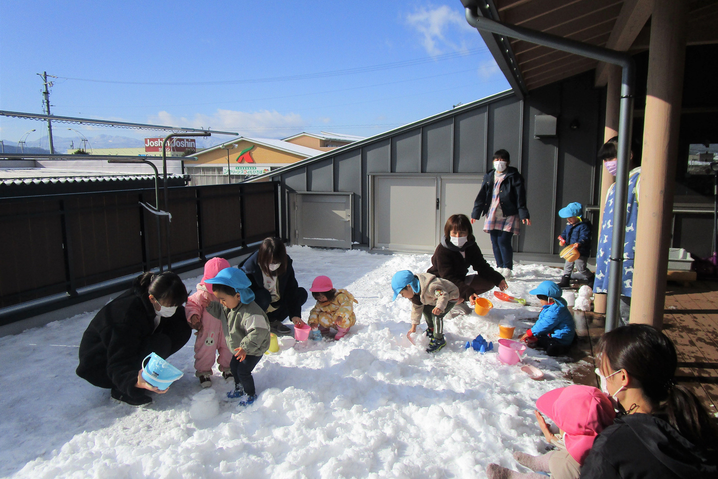 屋上テラス(あおぞらひろば)は雪のひろば、雪だるまを作ったり、雪のお山を作ったり、、、思う存分、冬を楽しみます