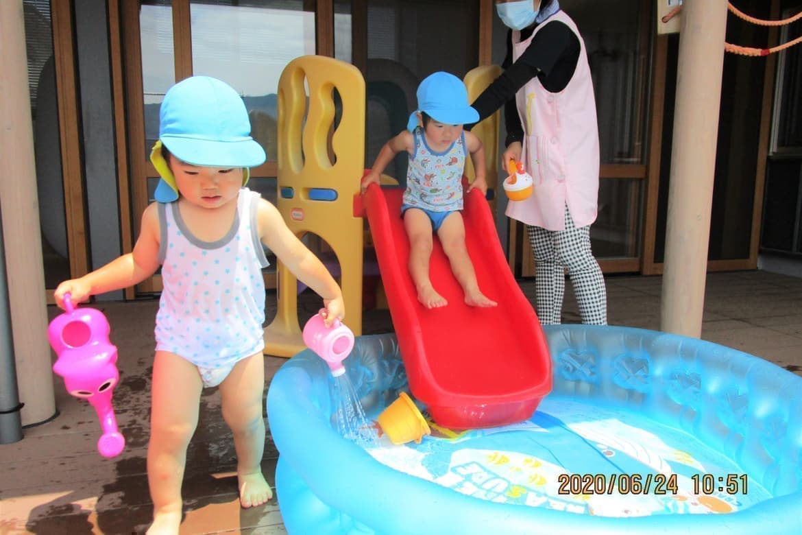 屋上テラス(あおぞらひろば)で、青空を見ながら元気にプール遊び、元気に遊んだ後は美味しい給食を食べて、ぐっすりお昼寝です。