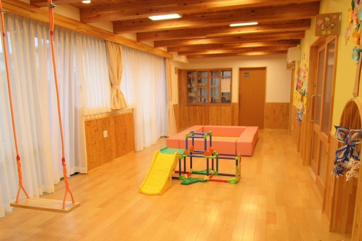 木造2階建ての園舎には、クライミングウオールや木製ブランコ、水遊びが出来る2階の屋上テラス「あおぞらひろば」など遊びの要素がいっぱい広がっています。