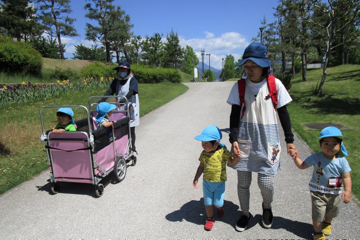 春の日差しを浴びて近くの公園へお散歩します。楽しいお話しをいっぱいして芝生の上で寝そべったり、かけっこをしました。みんな仲良しです。